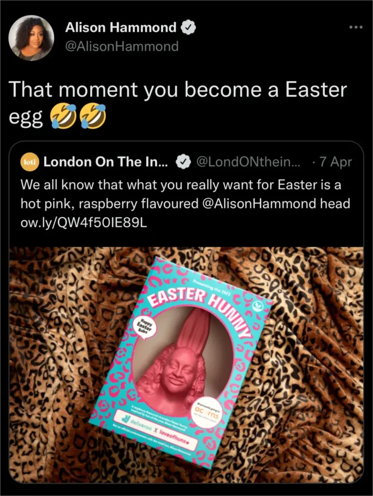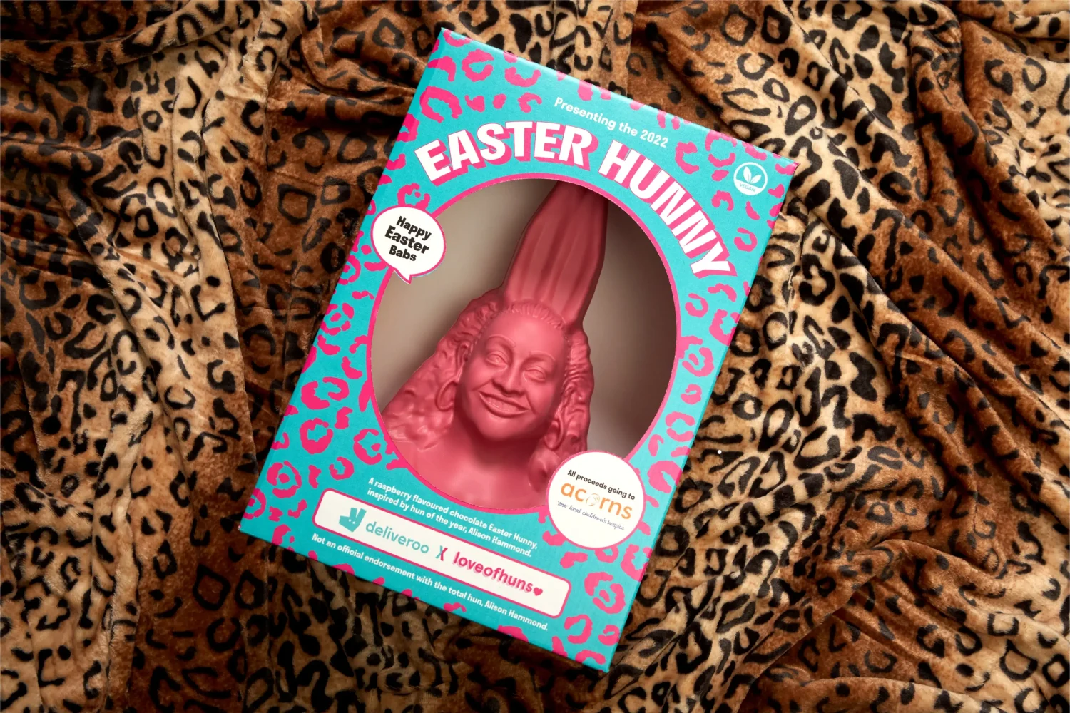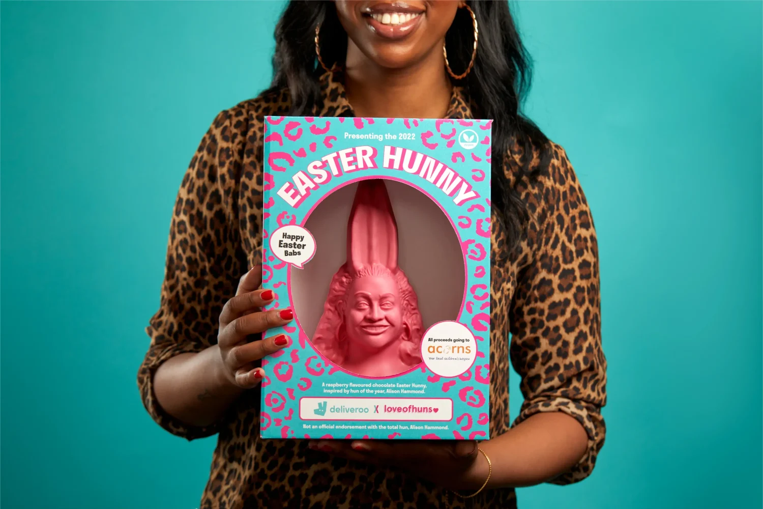 For Deliveroo's Easter activation 2022, Scoff Studios transformed 'Hun Of The Year' Alison Hammond into a fully edible vegan chocolate "egg"! Designing everything from 3D renders, through to bespoke moulds and packaging, Scoff produced and securely packaged the fully vegan Easter Hunnys before distributing to multiple Deliveroo outlets across the UK.